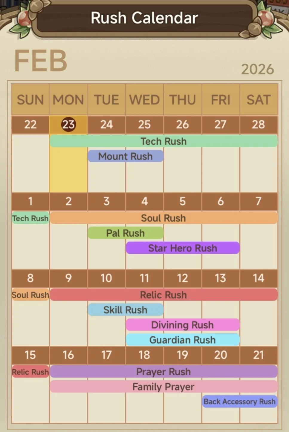 This is your Rush Calendar, here you can keep track of what rushes are next!