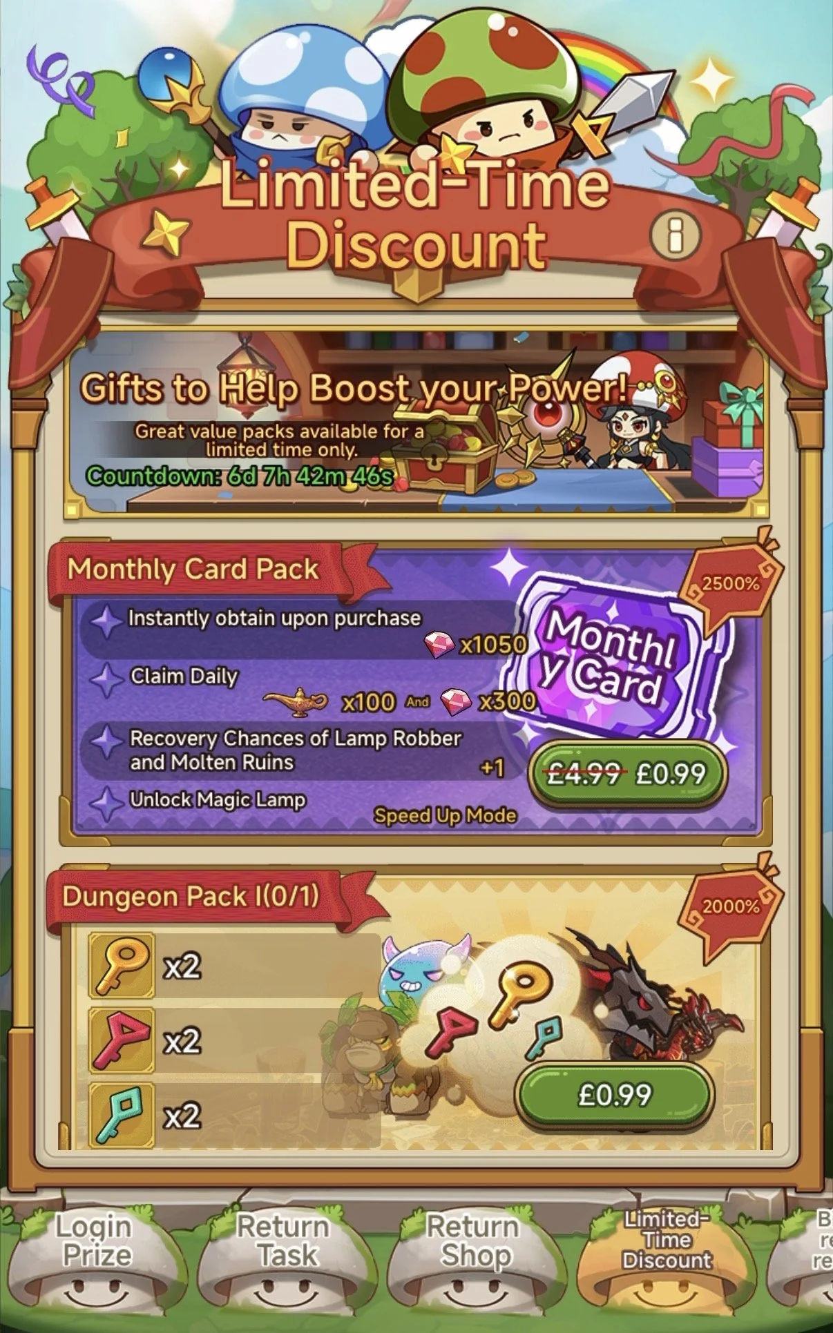 Firstly, there are Limited Time Discount packs for you during the event, the only one really worth mentioning is Monthly Card as it comes down to just $0.99!