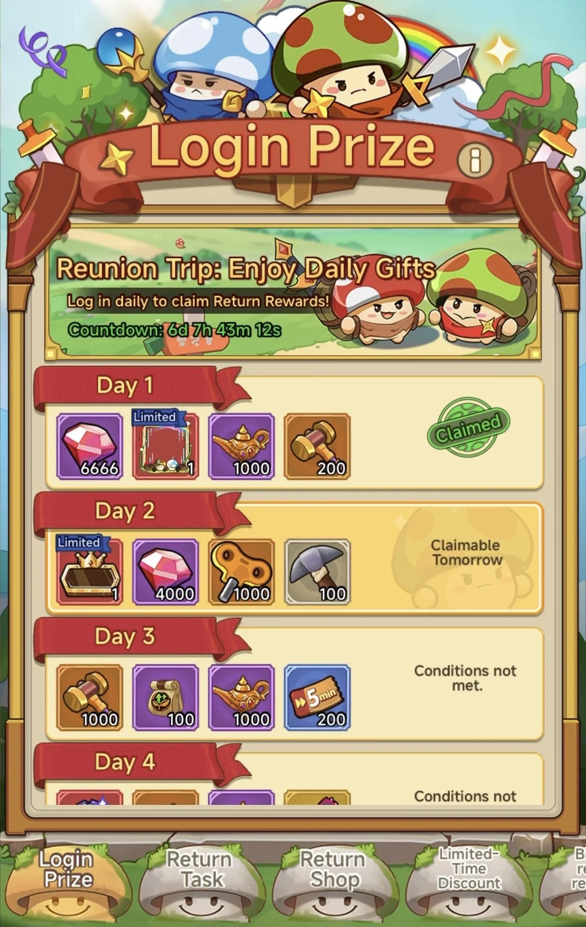 This is the part that makes doing this most worth it imo. There are 7 days to collect, the amounts of the items are quite good BUT, on day 6 you will get an awakening Crystal, if you have played the event correctly you should be all caught up by this point so this crystal gets you 1 ahead instantly