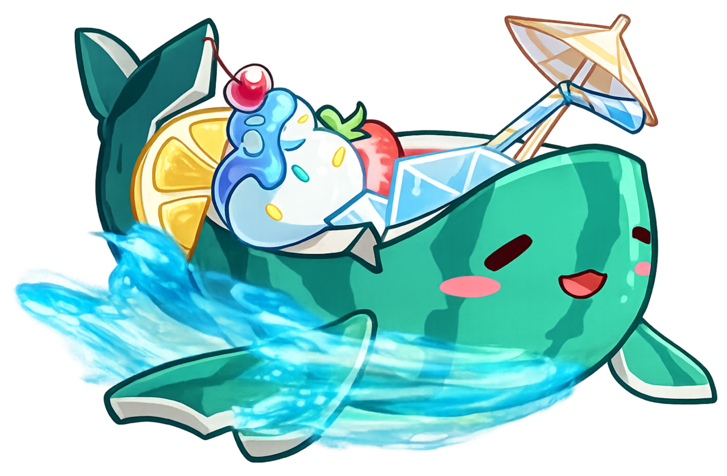Increases ATK by 10% and DEF by 30% every 11s for 5sAfter this, a Watermelon Ship is summoned to unleash a wave that launches enemies for 0.5s, dealing 2000% Skill DMG, 800% current Combo DMG, and 800% current Counter DMG as AoE DMG. (Triggers at the start of the battle)