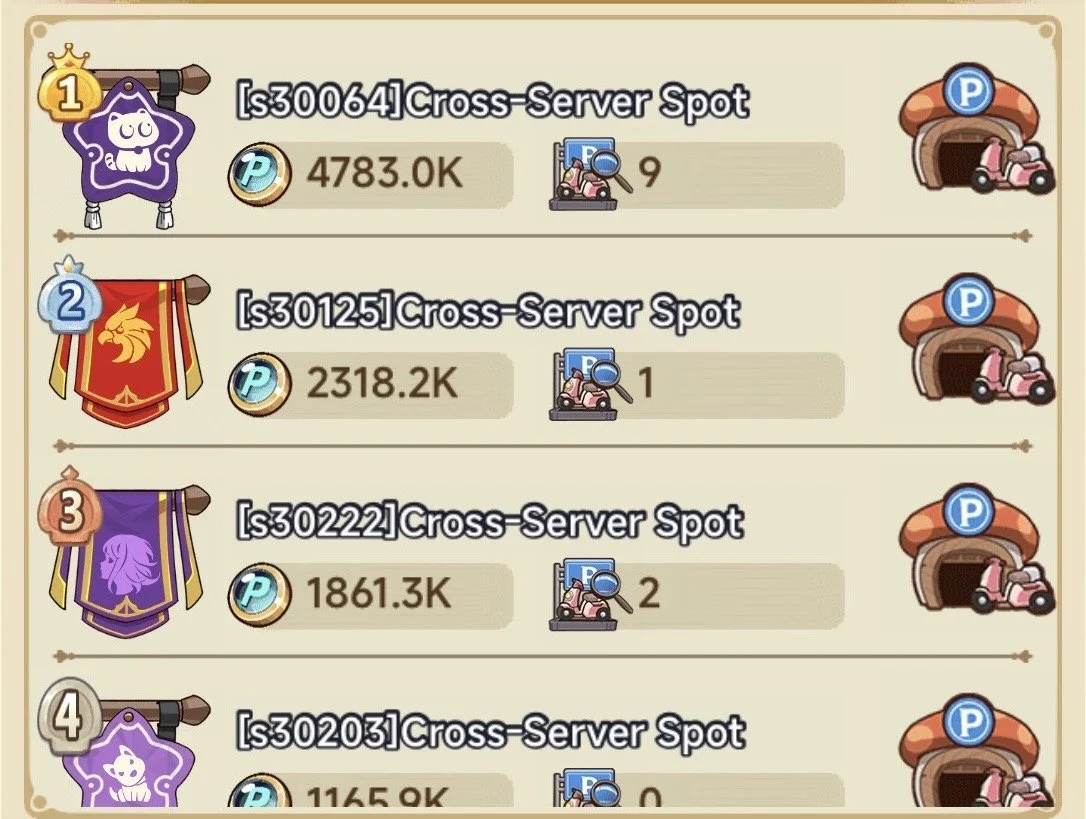 To get to Parking Wars you go to “Find Parking Lot” and then ‘Cross-Server Spots” you will see the 4 servers in that week (including your own), each server starts with 3 spots