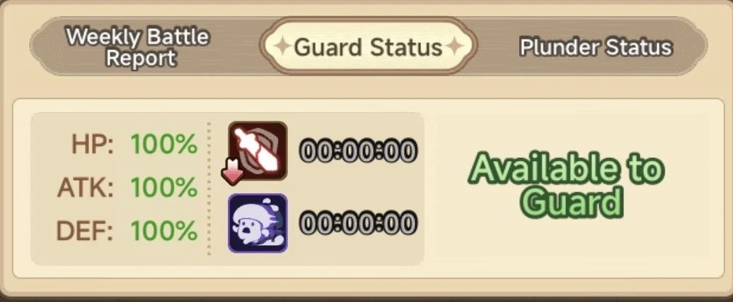 Next is “Guard Status”, as you win Guards you will gain Debuffs, when you die you will go into Cooldown. These are both shown here. You can also see HP, ATK, DEF, the HP will go down if you lose HP during Guarding and the other two will go down in correlation to your Debuffs! (Debuffs in Guard are capped at 8 which is 80% reduction)